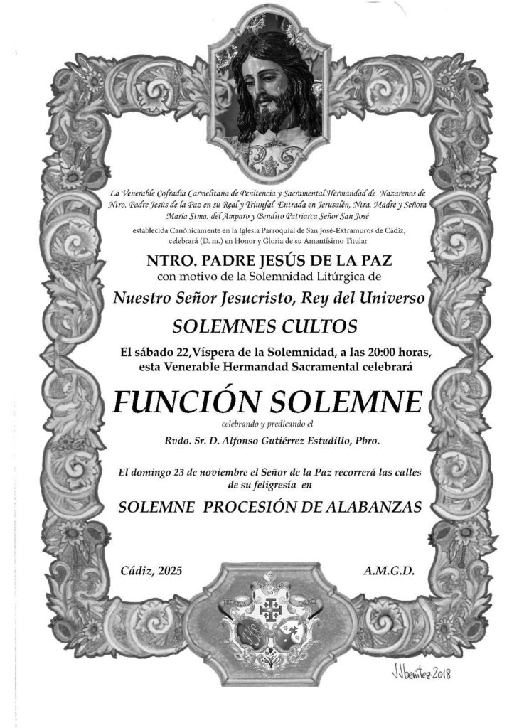 El sábado 22, a las 20:00h, celebraremos Función Solemne en las vísperas de la Solemnidad de Cristo Rey a mayor Gloria de Dios, presidiendo la misma el Rvdo. Sr. D. Alfonso Gutiérrez Estudillo, pbro., párroco y Director Espiritual de la Hermandad.